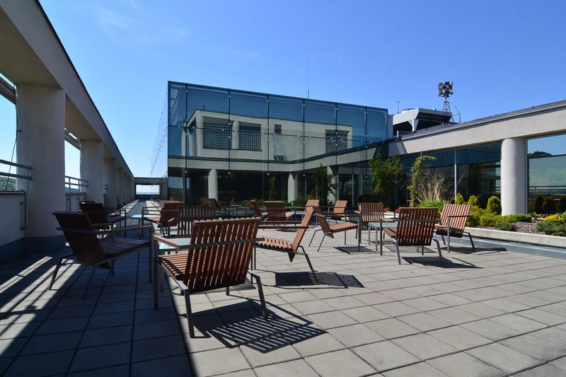 Terasa v 16. etáži je oproti dřívějšku přístupná celá. Prohlídková trasa po terase nově vede po okruhu, a to díky zprůchodnění šatny vedle zasedací místnosti zastupitelstva, čímž je umožněn pohled do strojovny vozíku na údržbu fasády, tzv. kočky, která je atraktivní technickou zajímavostí. Vyhlídka na terase je doplněna několika dalekohledy typově stejnými jako na amerických mrakodrapech. Provedení dalekohledů je v návaznosti na téma nové expozice Amerika ve Zlíně. Dalekohledy jsou opatřeny popiskami a graficky zpracovanými orientačními tabulemi. Hlavním exponátem a didaktickým prvkem terasy je model města Zlína z litého bronzu, které znázorňuje jeho podobu v 50. letech minulého století, tedy v post baťovském období.