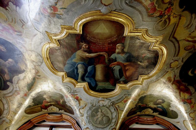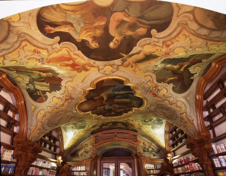 Klenutý strop je štukou a plastickou malbou rámců členěn v barokně formované pole. V lunetách jsou vyobrazeni slavní antičtí lékaři a lékárníci Demokritos, Andronikos, Celsus, Herophilos, Evagoras, Dioskorides, Theophastos a Galenus. Vedle alegorie Zkoušky a Rozumu má dominantní postavení zpodobení Herma a Hippokrata. Plynoucí čas znázorňují symbolické postavy ročních období.