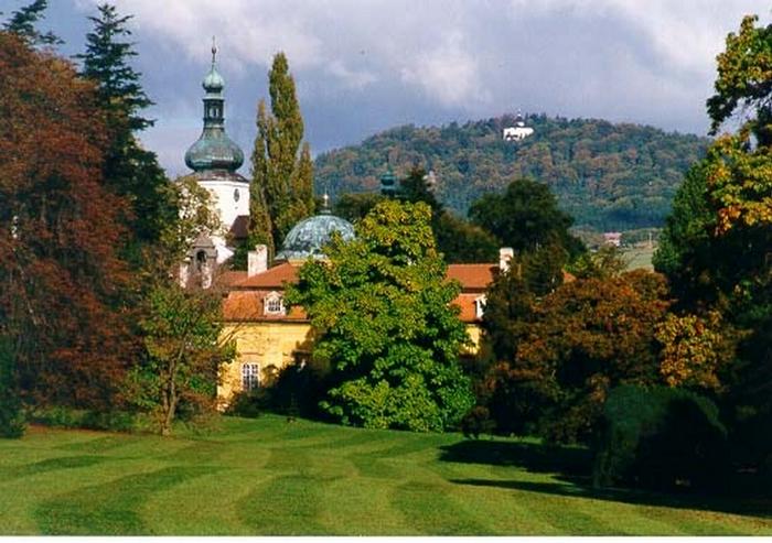 Zahrada byla zakládána současně s výstavbou zámku od počátku 18. století. Svažující se terén od západu k východu si vynutil její terasovité uspořádání. Nejvýše položenou terasu zaujímalo zámecké nádvoří s kašnou ve tvaru kvadribolu a s obeliskem uprostřed. Do kompozice zahrady byl začleněn také potok. Zikmund Karel Petřvaldský dal zhotovit dekorativní tepané mříže mezi pilíři s putty a vázami, spojující rizality hlavní budovy a oddělující nádvoří od parku. S nástupem Berchtoldů došlo postupně k podstatnému rozšíření zeleného areálu zámku - vznikal přírodně krajinářský park anglického typu, jehož nepravidelnou a živou kompozici tvořily travnaté plochy se skupinami jehličnatých a listnatých stromů. Zasloužili se také o výsadbu exotických a vzácných dřevin. Park oživuje množství soch. V parku byly založeny sortimentální sbírky rododendronů a obnoveny sbírky kbelíkových dekoračních rostlin. Od roku 1981 je zde každoročně prezentována sbírka světového sortimentu fuchsií ze zámeckého zahradnictví.