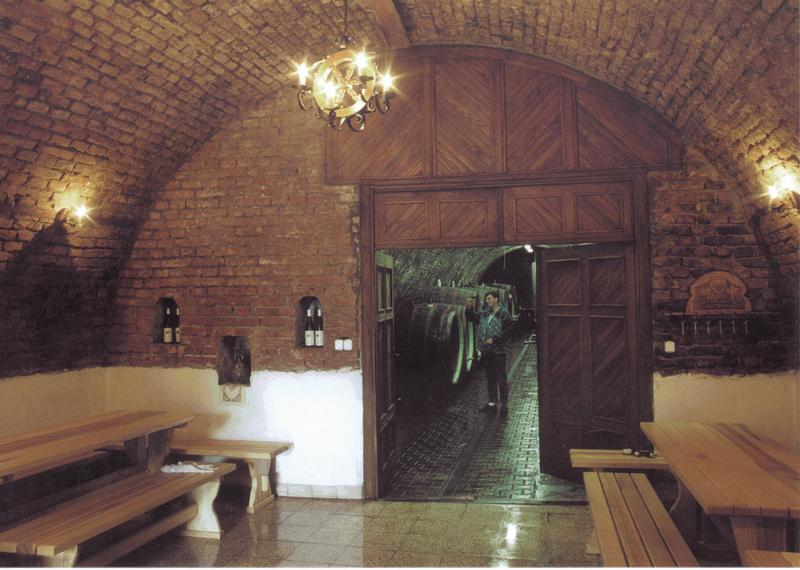 40 m dlouhý sklep za 17. století. Byl původně církevní, dnes jsou v něm uskladněna kvalitní sudová i lahvová vína z našeho regionu. Stylové posezení u krbu s pohárkem vínka Vám zpříjemní cimbálová muzika nebo country kapela a řízená degustace s poutavým výkladem majitele u dubových sudů.